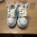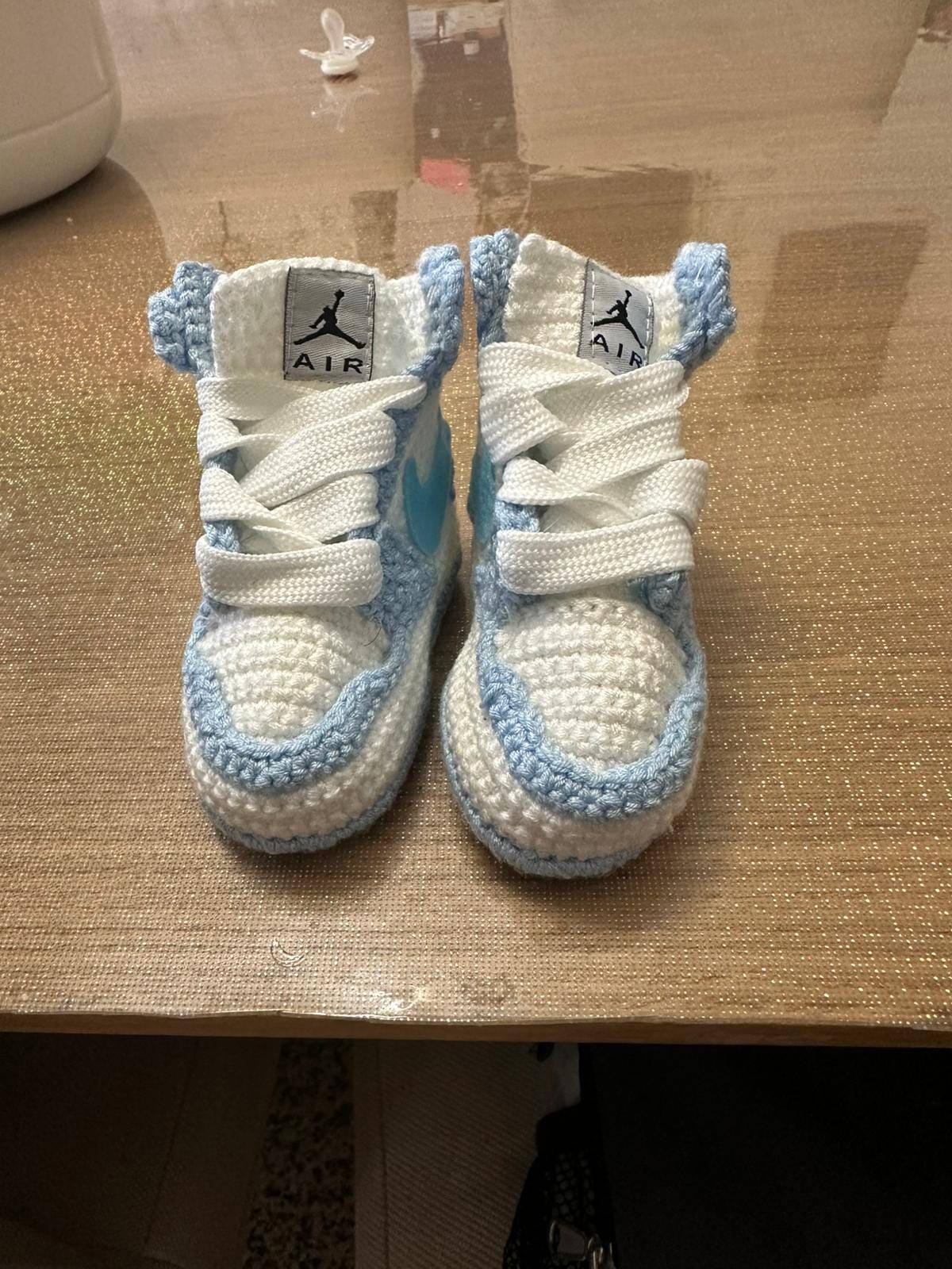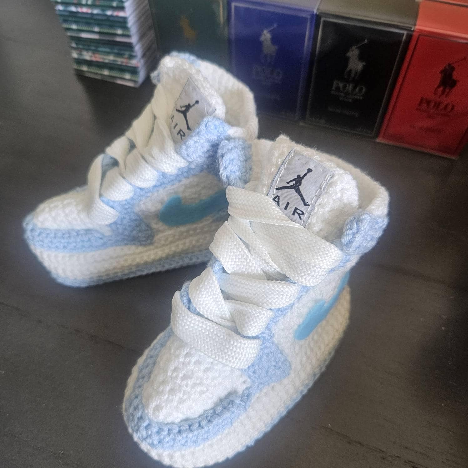 Celebrate your little one’s style with these Handmade Crochet Baby Soft Blue Jordan-Style Baby Booties. Inspired by the iconic retro basketball sneaker design, these baby shoes are crafted with love, care, and attention to detail, making them the perfect choice for sneakerhead parents and basketball fans alike.
